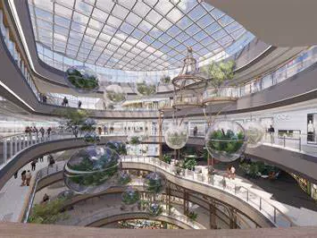 Japanski trgovački centar Fukaya Garden Tots: S čeličnom konstrukcijom s djelomičnim dvokatnim dizajnom, vanjski zidovi zgrade predstavljaju naborani izgled poput Origami, što ga čini karakterističnim obilježjem trgovačkog centra. Njegov sud za hranu nalazi se na drugom katu, nudeći dvostruki pogled na trgovački centar i udaljene planine.